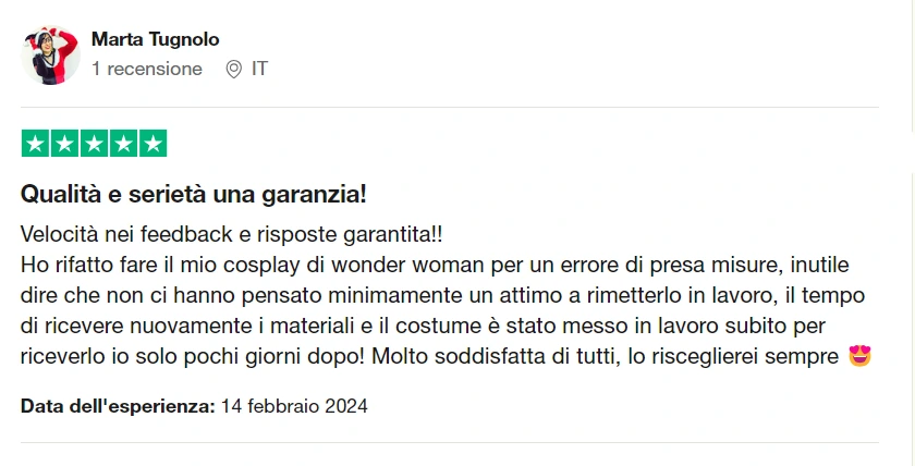 Tutti i nostri cosplay sono garantiti dalla nostra assicurazione Hakuna Matata. Se saremo noi che non rispetteremo le misure che ci darai lo rifaremo gratis!